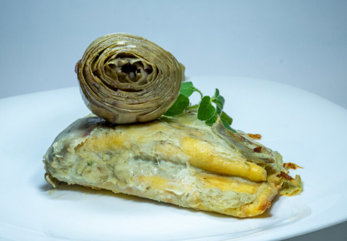 Il cuore del piatto è la farcia cremosa a base di ricotta fresca e taleggio, due formaggi che si completano a vicenda: la ricotta, leggera e setosa, smorza la personalità intensa e fondente del taleggio, creando un equilibrio rotondo e avvolgente. A impreziosire la preparazione ci sono i carciofi stufati, tagliati finemente e cotti lentamente in padella con un filo d’olio extravergine d’oliva, aglio e prezzemolo, fino a diventare teneri e profumati. Il loro gusto leggermente amarognolo regala profondità al piatto e contrasta con la dolcezza del formaggio.