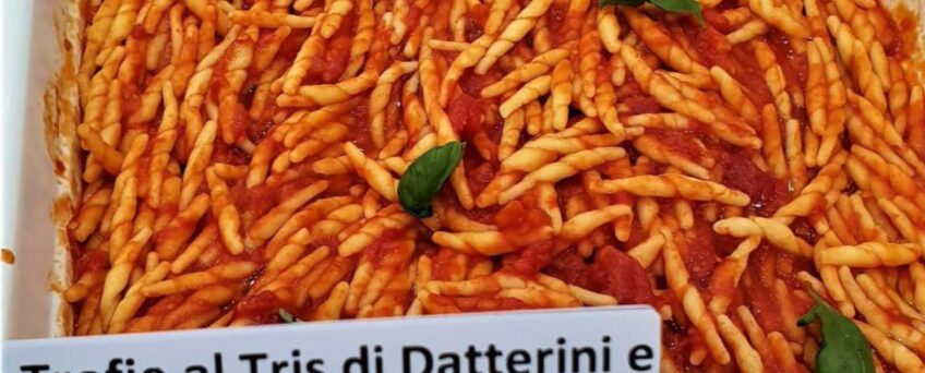 Un primo piatto semplice ma ricco di profumi e colori, che celebra la freschezza dell’estate. Le trofie, con la loro consistenza avvolgente, si sposano con un sugo leggero preparato con un mix di pomodorini datterini gialli, rossi e ciliegini, saltati brevemente in padella per mantenere intatta la loro dolcezza naturale. A completare, foglie di basilico fresco aggiunte a crudo per un tocco aromatico e profumato. Un filo di olio extravergine d’oliva a crudo esalta i sapori, rendendo il piatto gustoso e genuino.